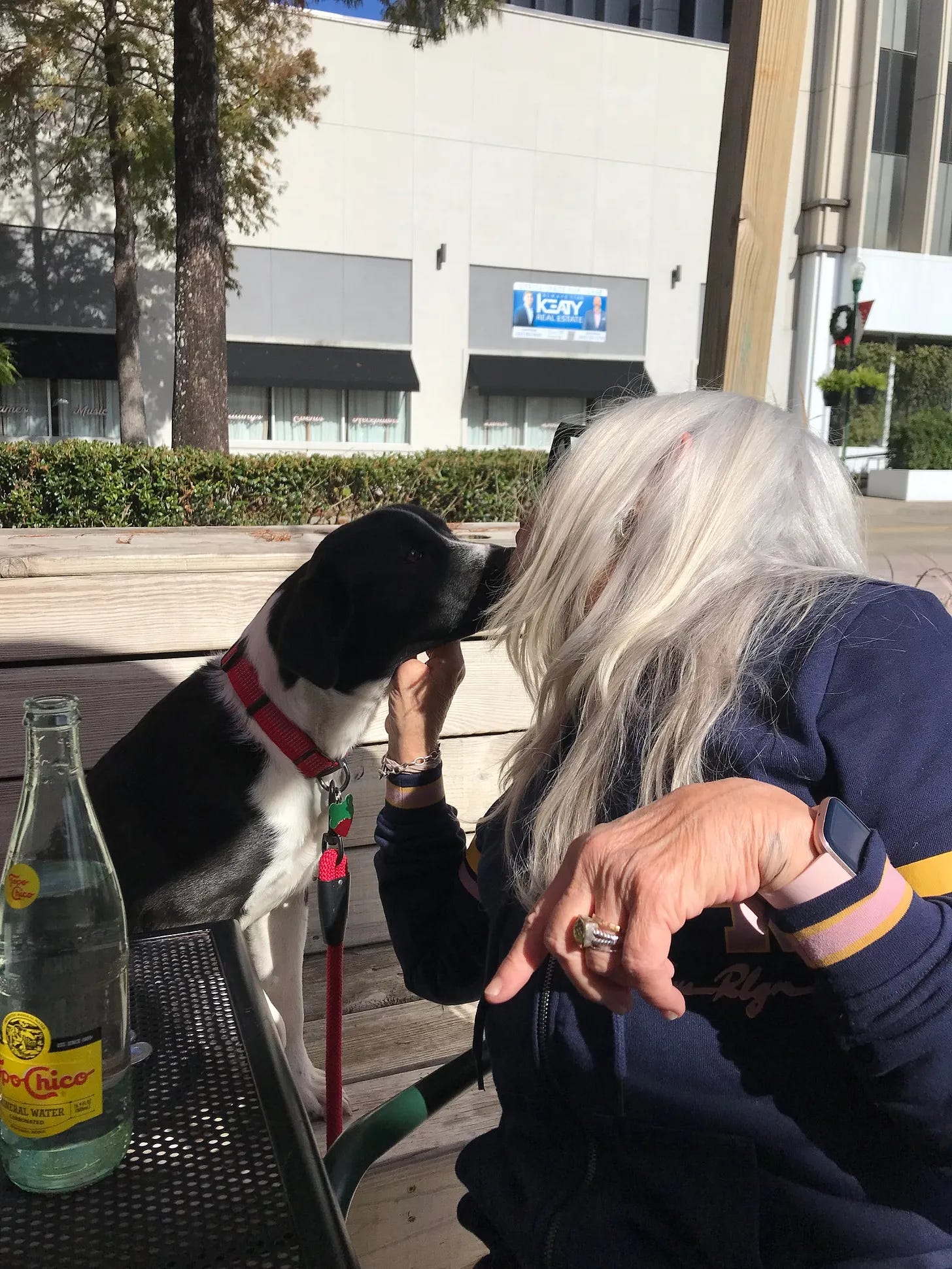 Her name is Manon. It’s a French name. She’s a Louisiana dog, a rescue, and because we live in Acadiana, in south Louisiana, and my wife, Gaywynn, is Cajun, we wanted a name that is French. The name Manon will be familiar to those who know the movie, Manon of the Spring (Manon des sources in French.) It’s not a well-known name in America, and so we inevitably have to say it more than once to people and explain why we chose it.