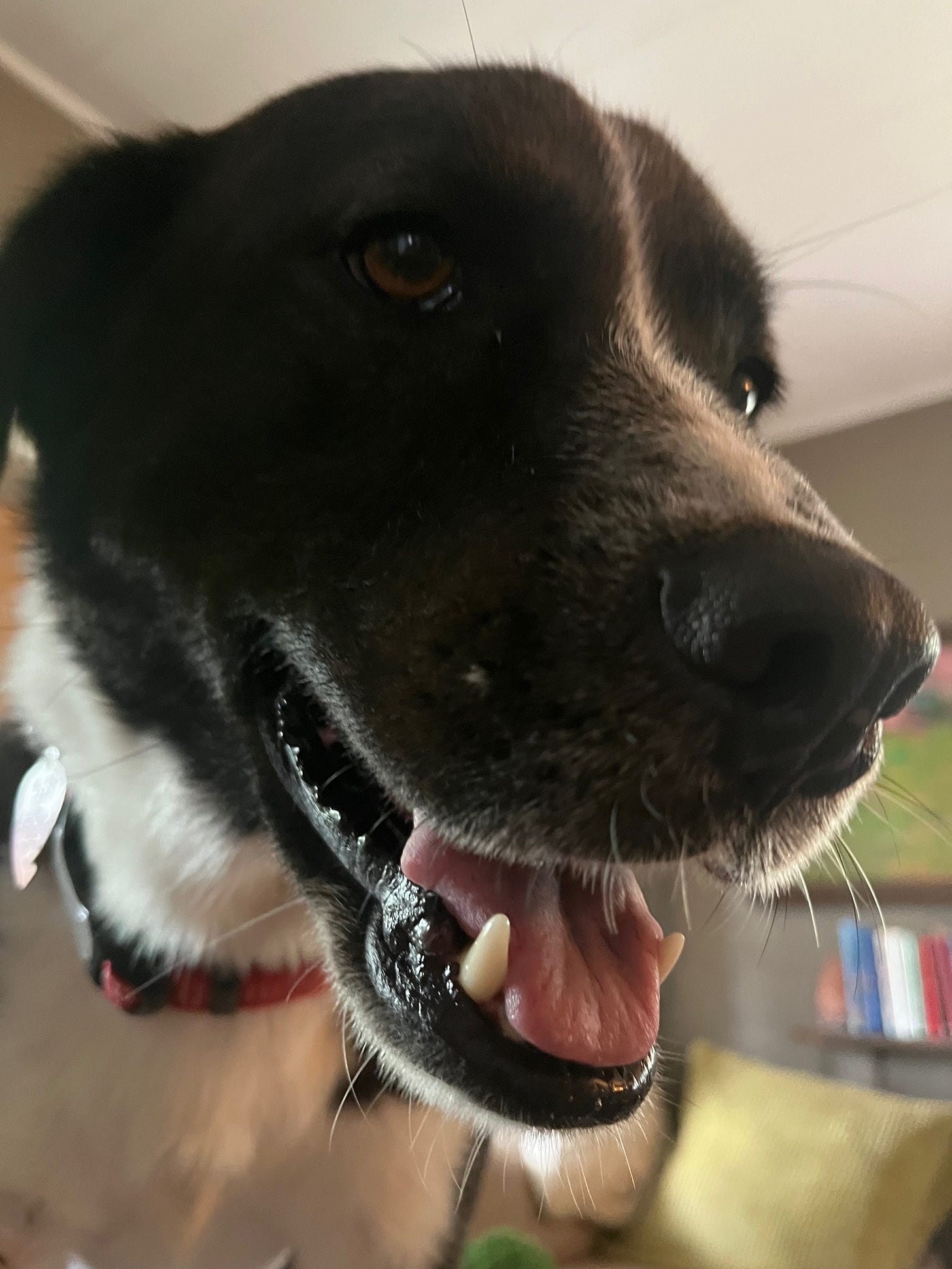 She weighs about forty pounds. She has ears that are luxuriously soft to the touch, flopping like beauty in your hands. The tip of her tail is white. She has wide, darkish spots on her belly. Her most distinguishing feature, though, is her underbite. You can’t see it when her mouth is closed, but when it’s open, you can. It’s both comical and a bit scary.